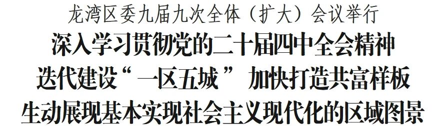 12月22日,龙湾区委九届九次全体(扩大)会议举行。 区委常委会主持会议。龙湾区委书记、温州湾新区党工委副书记夏禹桨作报告并讲话,区委副书记李丹、陈汉存出席。 全会深入学习贯彻党的二十届四中全会精神和习近平总书记考察浙江重要讲话精神,全面贯彻中央经济工作会议、省委经济工作会议精神,认真落实省委十五届八次全会、市委十三届九次全会重要部署,审议通过《中共温州市龙湾区委关于制定龙湾区国民经济和社会发展第十五个五年规划的建议》,进一步动员全区上下深入践行“八八战略”,迭代建设“一区五城”,推动高质量发展建设共同富裕示范区龙湾样板取得决定性进展,奋力谱写中国式现代化温州湾、龙湾新篇章。 全会认为,党的二十届四中全会是在我国即将进入基本实现社会主义现代化夯实基础、全面发力的关键时期召开的一次重要会议,对未来5年我国发展作出顶层设计和战略擘画,是乘势而上、接续推进中国式现代化的又一次总动员、总部署。省委十五届八次全会进一步明确了我省“十五五”时期的方位定位、关键战略引领和关键领域重大突破,擘画了浙江发展新蓝图。市委十三届九次全会立足温州“十五五”时期发展使命,吹响了提速打造全省高质量发展“第三极”、高质量发展建设共同富裕示范区市域样板,生动展现基本实现社会主义现代化的市域图景的奋进号角。当前,温州湾、龙湾发展“天时、地利、人和”俱备,责任重大、潜力巨大、前景光明,全区上下要准确把握“十五五”时期温州湾、龙湾发展的历史方位、战略机遇和突破路径,一往无前、奋勇争先,谱写崭新篇章。 全会认真总结“十四五”发展取得的重大成就,科学分析当前形势,进一步明确我区“十五五”发展的方位定位。一致认为,“十四五”时期,是龙湾发展极不寻常、极不平凡的五年。面对错综复杂的外部环境和艰巨繁重的改革发展稳定任务,全区上下坚持以习近平新时代中国特色社会主义思想为指导,全面贯彻落实习近平总书记重要讲话重要指示批示精神和考察浙江重要讲话精神,深入践行“八八战略”,聚焦省委、省政府和市委、市政府部署要求,高水平建设温州湾新区、高质量打造“一区五城”,开启两区一体化融合发展新篇章,办成了一批事关全局、影响深远的大事要事,推动经济社会实现深层次、全方位的精彩蝶变。五年来,龙湾综合实力迈上历史性台阶,科技创新取得突破性成效,现代城区呈现系统性蝶变,改革开放打造标志性成果,共同富裕取得实质性进展,文化发展彰显独特性魅力,治理效能得到整体性提升,党的建设发挥引领性作用。今年以来,全区经济运行稳进向好,“两新”融合深度推进,改革开放迸发活力,城区发展更具内涵,民生福祉更加可感,党的建设持续加强。这些发展成就的取得,根本在于习近平总书记领航掌舵、在于习近平新时代中国特色社会主义思想科学指引,是省委、市委正确领导的结果,也是全区党员干部和广大群众团结奋斗、顽强拼搏的结果。 全会指出,回顾五年的奋斗历程,经验启示弥足珍贵,为我们迈向“十五五”提供了重要遵循。一要坚定不移沿着习近平总书记指引的方向奋勇前进,坚决做到“总书记有号令、党中央有部署,省委、市委有要求,温州湾、龙湾见行动走在前”。二要坚定不移深入践行“八八战略”,坚持一张蓝图绘到底,以钉钉子精神接续奋斗。三要坚定不移融入和服务省市发展大局,自觉从全局谋划一域、以一域服务全局,走出一条契合温州湾、龙湾实际的高质量发展之路。四要坚定不移把人民立场作为根本立场,用心用情解决群众“急难愁盼”,让群众在迈向共同富裕中有更多的获得感。五要坚定不移加强党的全面领导和全面加强党的建设,大力弘扬“六干”作风,着力锻造忠诚干净担当的高素质干部队伍。 全会指出,“十五五”时期,将是温州湾、龙湾破解深层次矛盾、突破结构性瓶颈的攻坚跃升期,是重塑竞争优势、确立区域标杆地位的战略窗口期,更是建设温州提速打造全省高质量发展“第三极”的样板区、高质量发展建设共同富裕示范区龙湾样板的决战决胜期。奋进“十五五”,必须洞察大势、放大优势,变压力为动力,在危机中育新机、于变局中开新局,以战略主动赢得发展主动,以一域发展为全省全市大局增光添彩;必须找准坐标、战略融入,变被动为主动,加快实现从“工业大区”到“经济强区”、从“地理枢纽”向“战略枢纽”的历史性跨越,让“龙湾坐标”在全省全市发展版图中更加凸显;必须勇于创新、发展破局,变“跟跑”为“领跑”,加快构建科技成果从“实验室到市场”的全链条转化生态,培育壮大技术密度高、成长空间广、带动作用强的新质生产力,全力锻造“十五五”时期“弯道超车”的强劲引擎;必须践行宗旨、为民造福,变“先富”为“共富”,统筹做好“强城”“兴村”“融合”三篇文章,推进公共服务扩容提质,打造一批共同富裕先行示范标志性成果,让发展红利更多惠及全区人民。 全会提出,“十五五”时期,要围绕温州提速打造“一圈一极一中心”战略部署,坚持工业为基、科创为核、人才为要、开放为径、城市为本、幸福为纲的工作基调,以因地制宜发展新质生产力为主线,加快实现科技创新引领、先进智造跃升、枢纽经济发力、全域共富先行,努力成